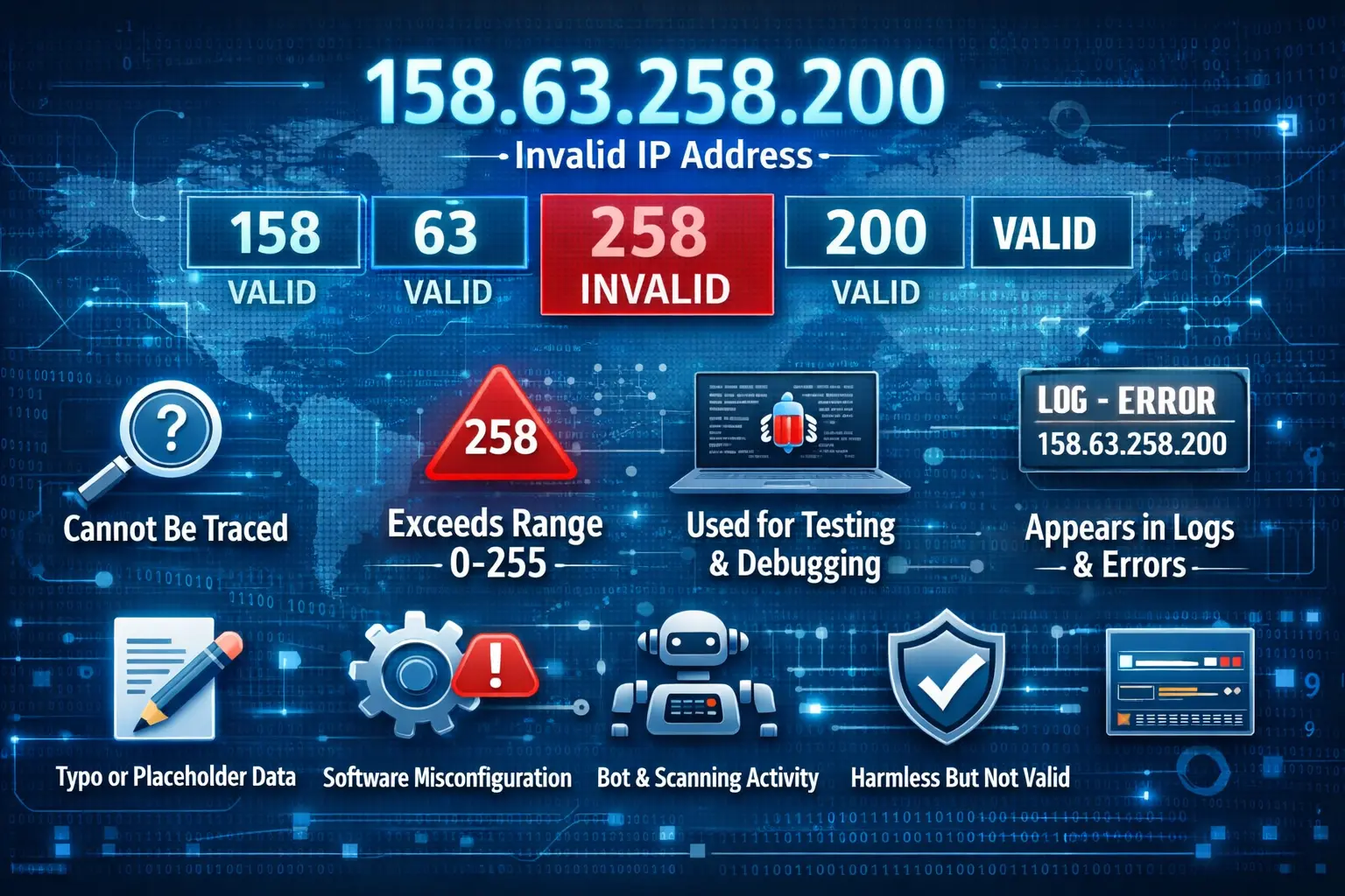 Even though 158.63.258.200 cannot exist on the internet as a valid address, it may still appear in server logs, software systems, or digital reports. There are several reasons for this: